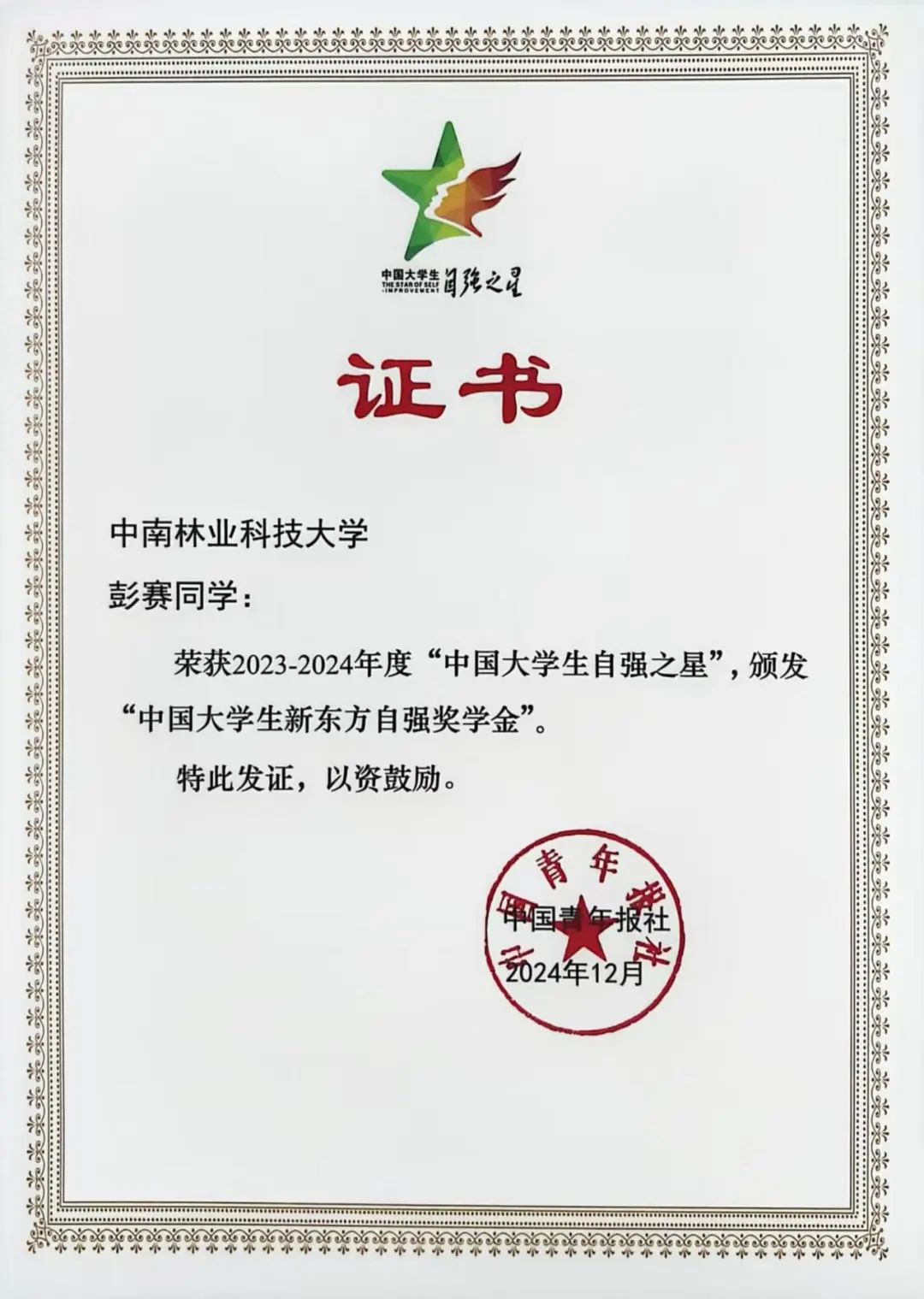 近日由共青团中央、全国学联指导团中央基层建设部、中国青年报社主办的2023-2024年度“中国大学生自强之星”奖学金推报活动结果揭晓,我院2021级本科生彭赛获“中国大学生自强之星”称号。